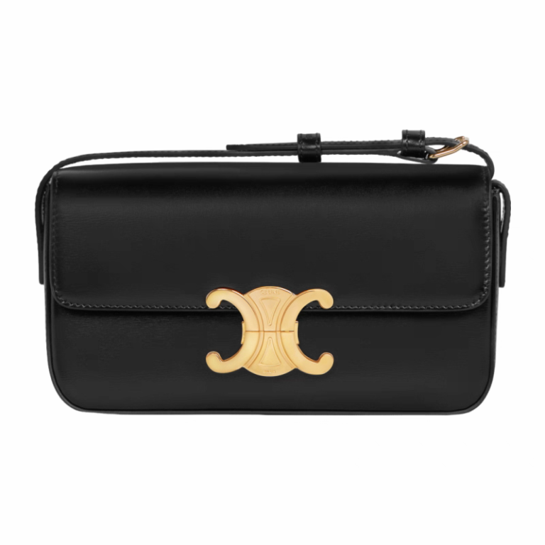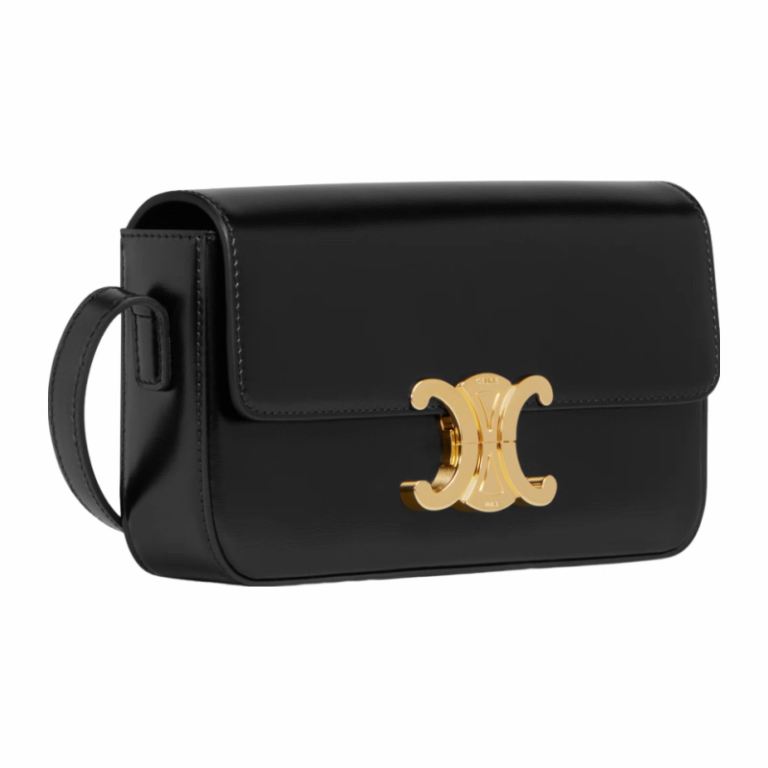 Celine Black Classique Triomphe: shiny calfskin, gold hardware, 8×5×2",  adjustable strap.