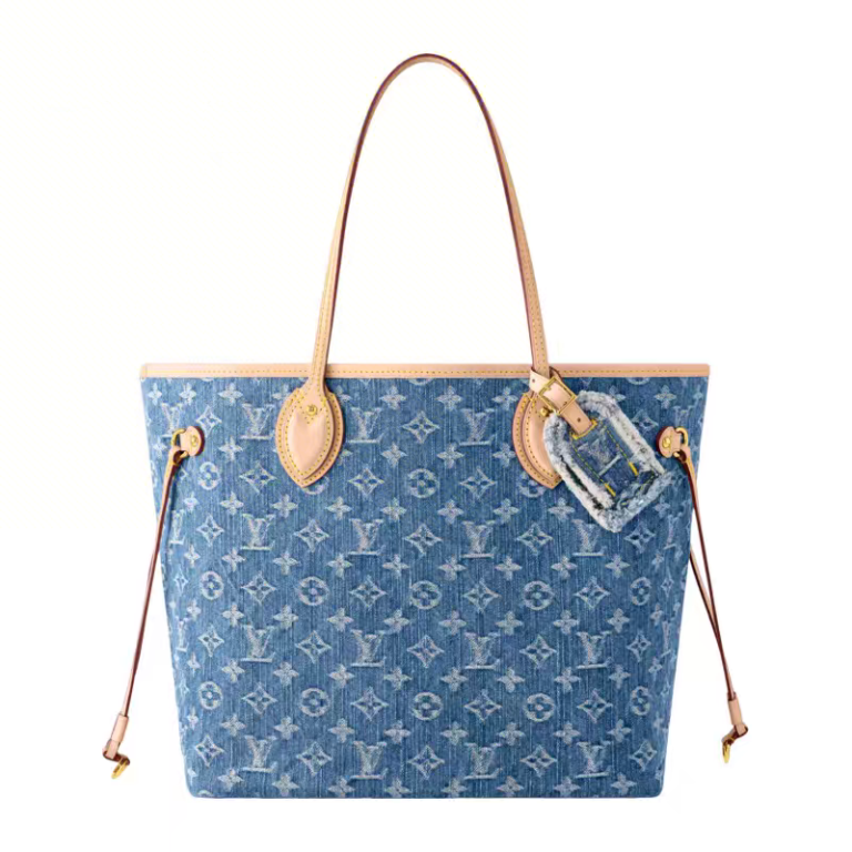 Neverfull MM in Monogram denim, adjustable side laces, fits 13-inch laptop, detachable zipped pouch & multi-pockets for urban use.