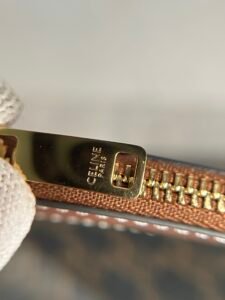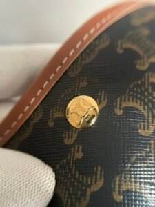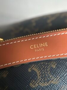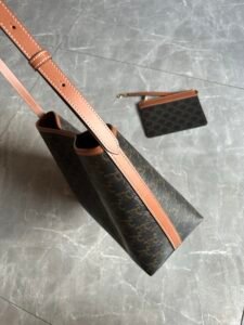 Celine Soft Shopper: Triomphe canvas, calf trim, gold snap, 12.8×9.7×5.5″, adjustable strap, shoulder/crossbody.