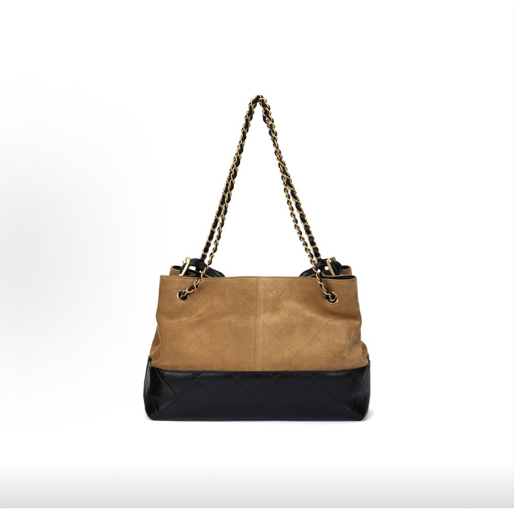 Material: Suede & lambskin two-tone patchwork, fabric lining, gold-tone hardware, interlocking CC emblems