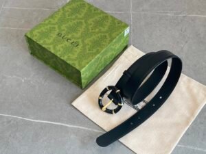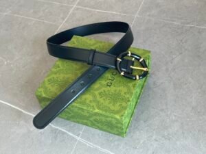 GUCCI Women’s new black leather belt features a round bamboo buckle, blending classic and modern styles. Ideal for styling and collecting.