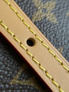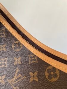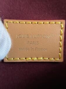 Monogram coated canvas, cowhide leather trim, fabric lining, metal hardware, zip closure with drawstring, internal slip pocket, detachable name tag. Non-detachable adjustable shoulder strap. Dimensions: 36×19×10 cm