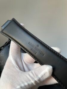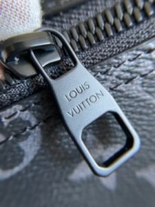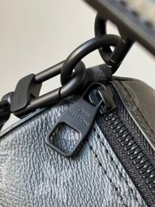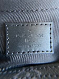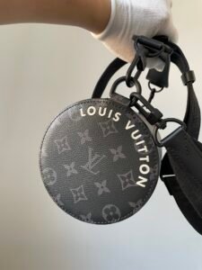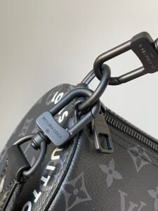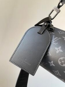 Monogram Eclipse coated canvas, cowhide leather trim, detachable adjustable shoulder strap, fabric lining, metal hardware, zip closure, internal slip pocket, detachable name tag. Dimensions: 26×14×14 cm