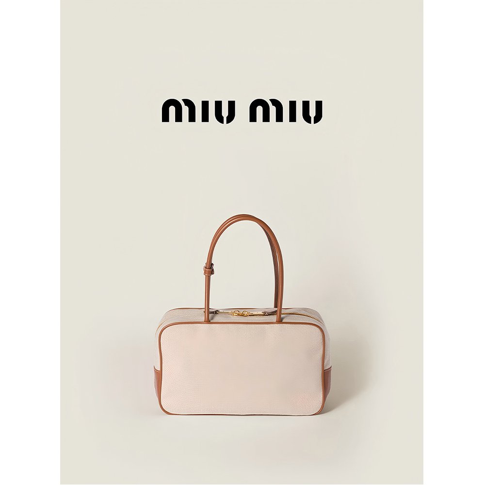 Miumiu Engraved Logo Canvas & Leather Top-Handle Shoulder Bag with Zipper Closure