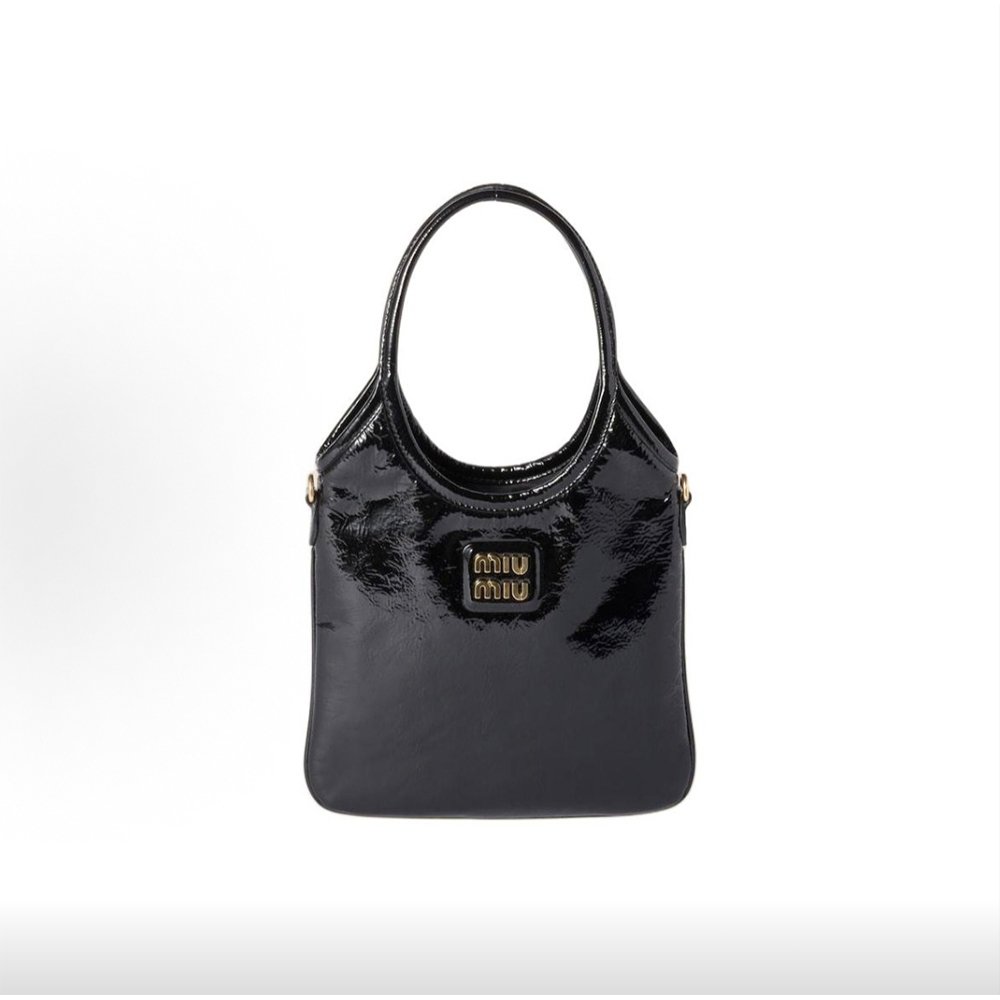 This iconic tote bag is elevated with polished metallic accents and the signature Miu Miu lettering emblem, embodying timeless elegance with instant recognizability. It features top handles, a lined interior with a zippered pocket, and easily accommodates an iPhone 15 Pro Max, a Miu Miu card holder, a Miu Miu large wallet, along with other daily essentials—even a MacBook Pro fits effortlessly inside.