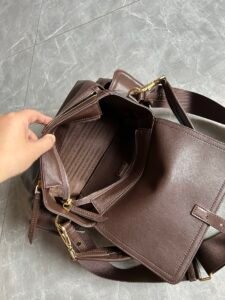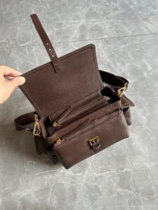 Polished Nappa leather, vintage finish, multi-pocket, elegant & functional, iconic craft details