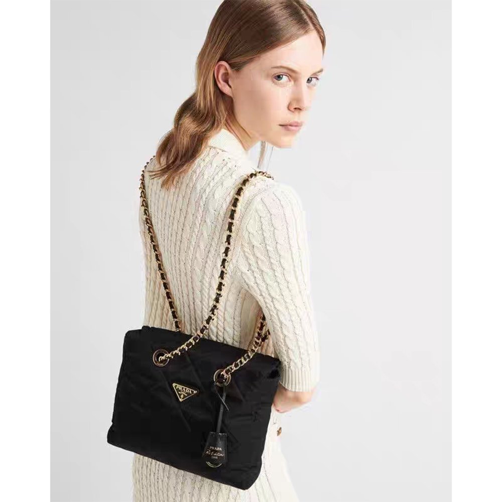 Expertly constructed with lightweight padding and precise topstitching, this piece is elevated by leather chain handles, sleek metal hardware, and the iconic enameled metal triangle logo emblazoned on the front. Secured by a smooth zip closure, the interior boasts a logo-printed Re-Nylon lining with a dedicated zip pocket, merging archival luxury with functional design.