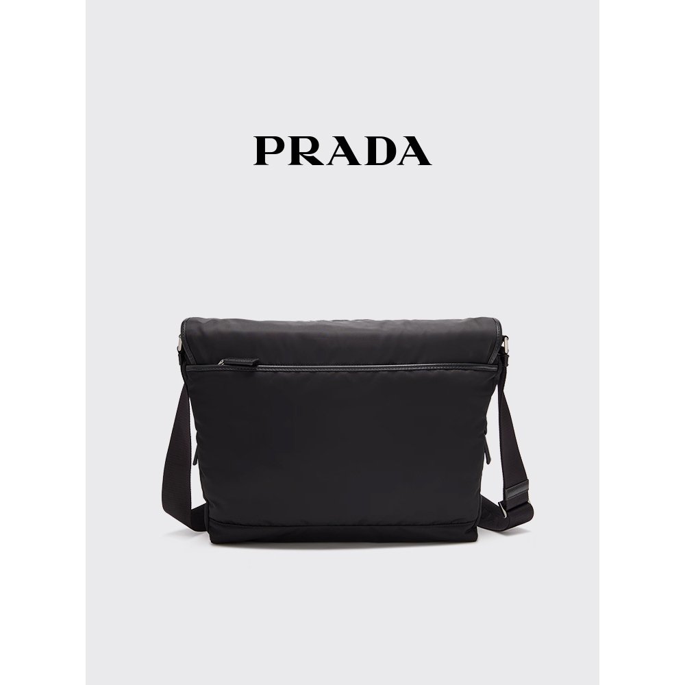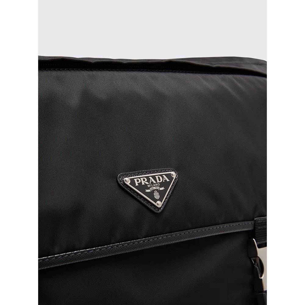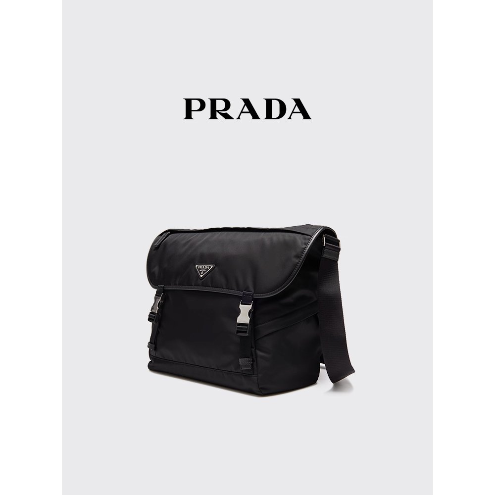 Adorned with the legendary enameled metal triangle logo, it features a detachable, adjustable nylon and leather shoulder strap for personalized comfort, plus a removable mini pouch that adds modern versatility. The flap closure with a side-release buckle ensures security, while an external pocket and Re-Nylon logo-print lining with organized compartments keep daily essentials within easy reach. Compact yet functional, this shoulder bag transitions effortlessly from urban commutes to casual outings, proving that sustainability and luxury can coexist in perfect harmony.