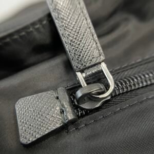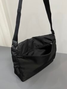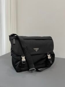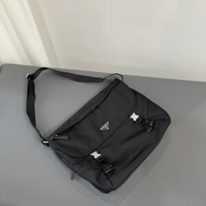 This iconic shoulder bag fuses eco-friendly Re-Nylon (crafted from marine plastic waste, waterproof and durable) with luxurious Italian Saffiano leather, renowned for its scratch-resistant crosshatch texture. It features brand-customized waxed threads in deep ink-blue (corrosion-resistant under close view), signature brushed metal buckles, premium Lanpo zippers, and an original-brand hardware logo plaque for flawless refined appeal. Designed with a secure buckle closure, organized pockets, and an adjustable strap, it seamlessly transitions between daily commutes and casual outings, embodying Prada’s signature blend of sustainable innovation, timeless craftsmanship and versatile luxury.