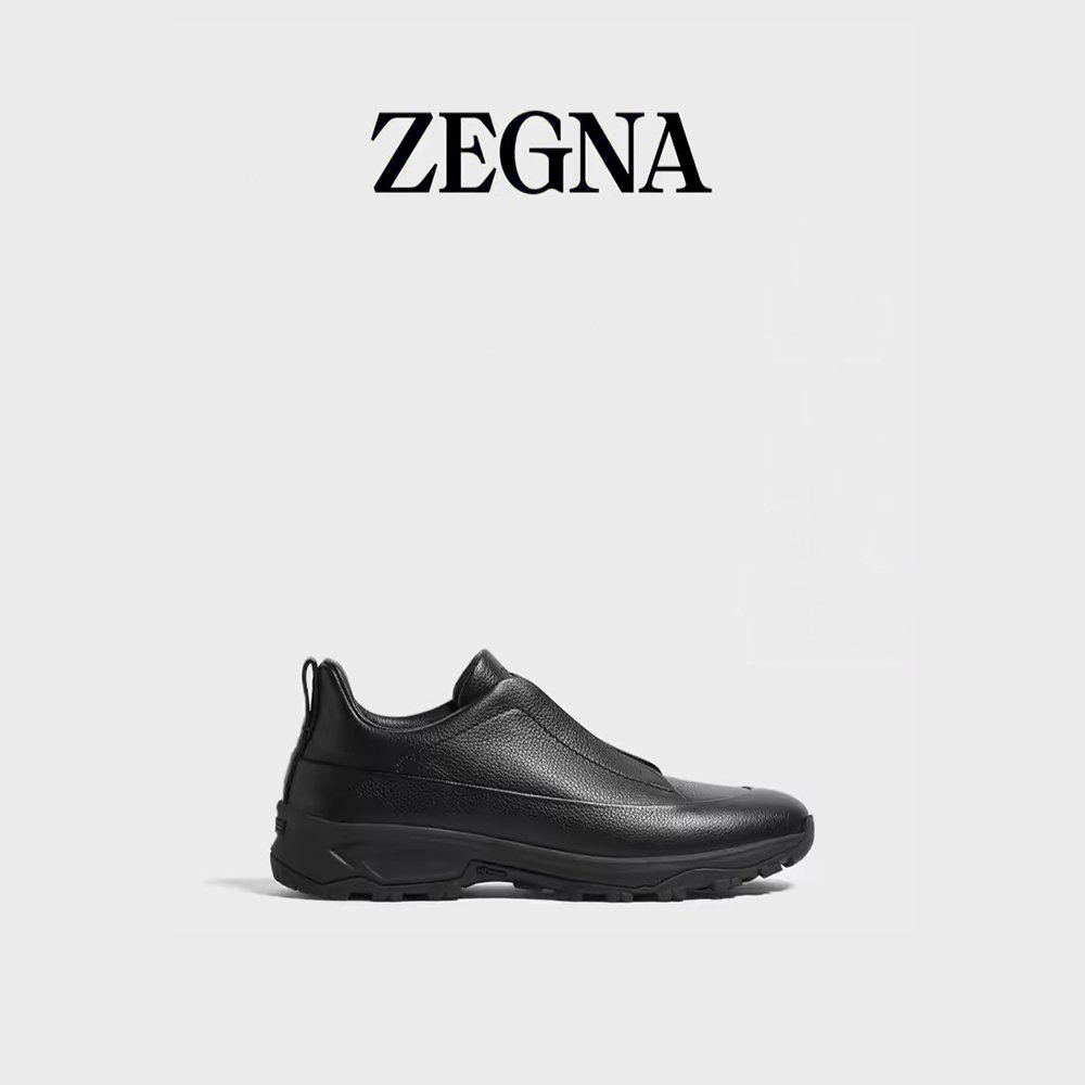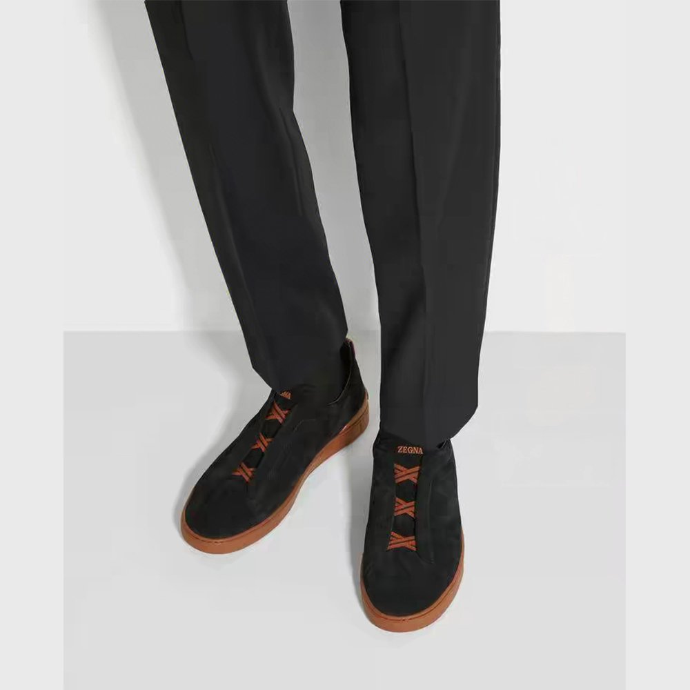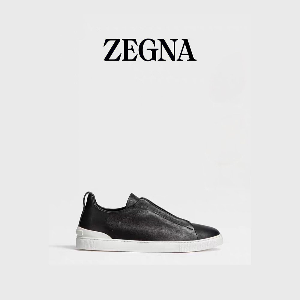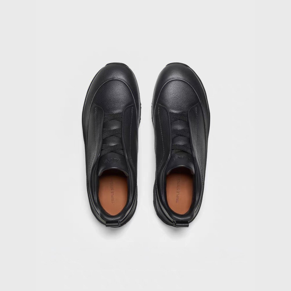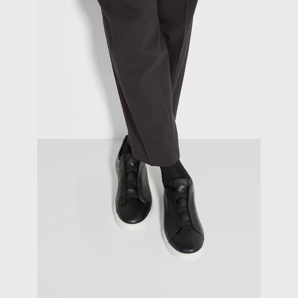 Zegna Triple Stitch Monte Men’s Black Calf Leather Round-Toe Cross Elastic Band Low-Top Casual Lifestyle Shoes