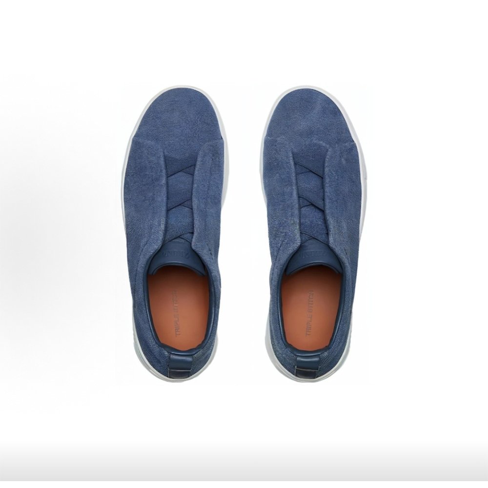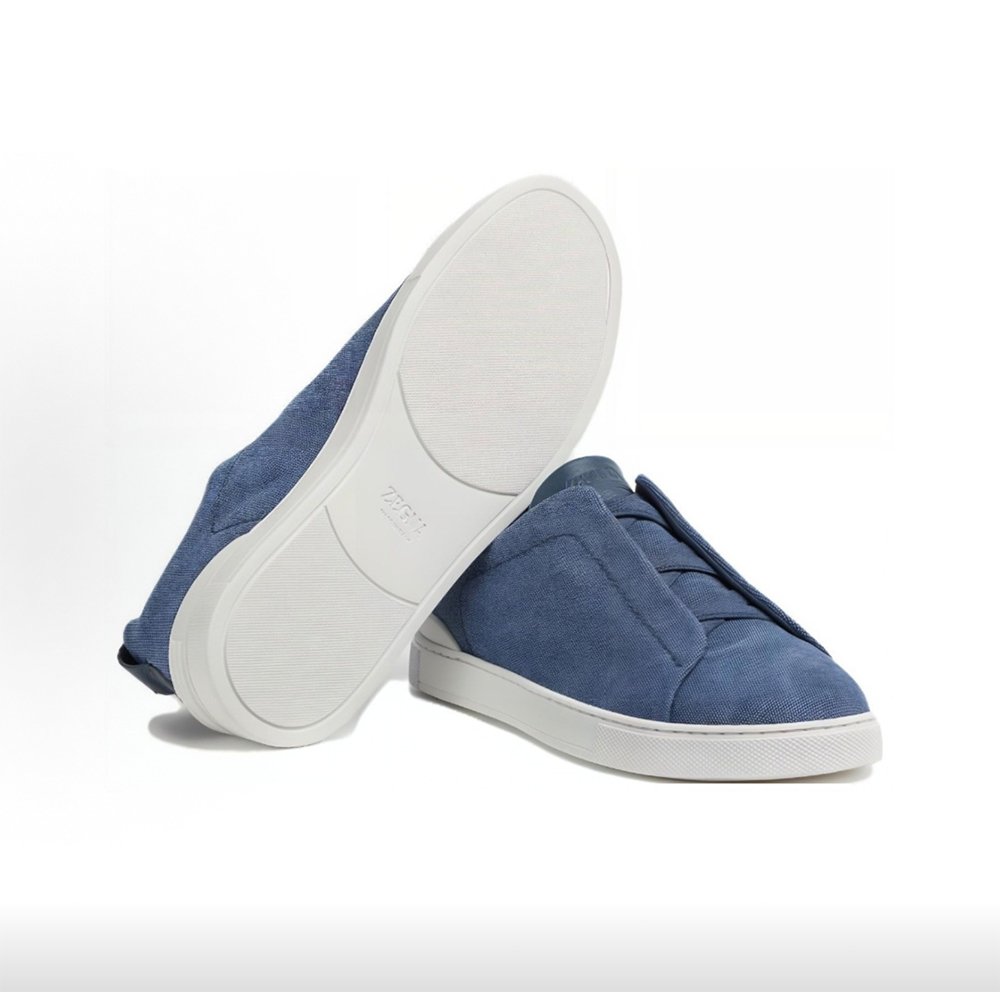 Zegna Triple Stitch Blue Linen Canvas Slip-on Sneakers, Italian Crafted, Breathable & Versatile.